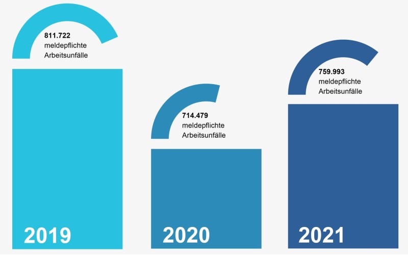 Die Zahl der meldepflichtigen Arbeitsunfälle betrug im vergangenen Jahr 759.993. Das waren 45.514 mehr als im Vorjahr, aber immer noch deutlich weniger als 2019 (811.722). (Grafik: DGUV)