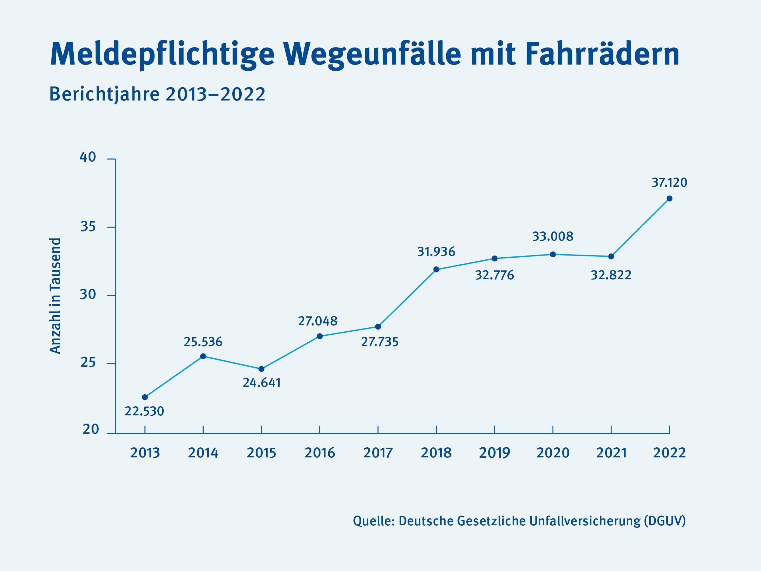 "Seit einigen Jahren nimmt der Anteil der Menschen zu, der sich ausschließlich oder häufig per Fahrrad im Straßenverkehr bewegt. Diese Entwicklung ist gut für die Umwelt, gut für die allgemeine Gesundheit und Fitness – sie spiegelt sich aber auch leider in der Zahl der Unfälle auf dem Weg zur Arbeit. In den vergangenen zehn Jahren ist die Zahl der meldepflichtigen Wegeunfälle mit dem Fahrrad (XLSX, 14 kB) von rund 22.500 auf über 37.000 gestiegen. Inzwischen ist mehr als jeder fünfte Wegeunfall, den wir verzeichnen, ein Unfall mit dem Fahrrad. Auch die Zahl der Unfälle mit dem E-Bike oder Pedelec steigt rasant. Sie hat sich von 2019 bis 2022 mehr als vervierfacht.