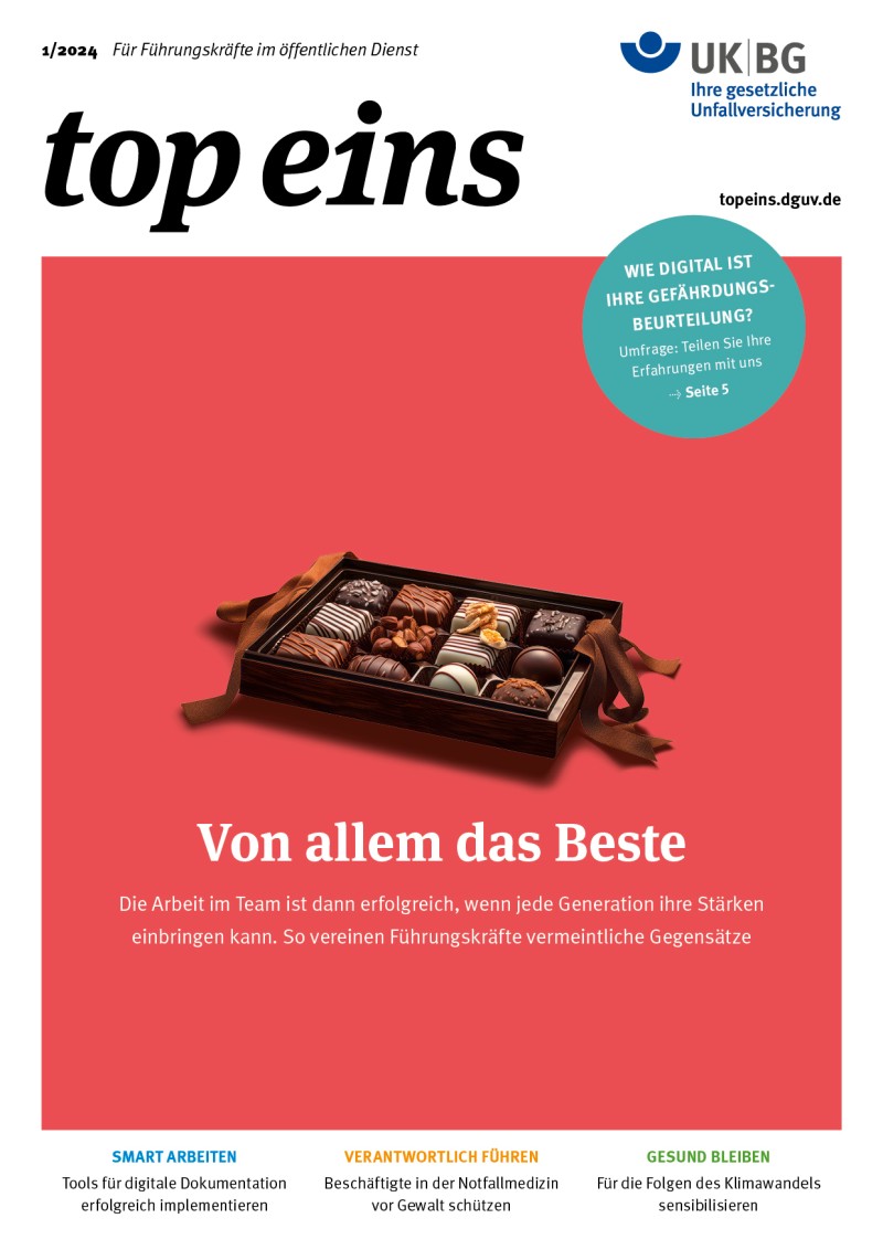 "top eins" bietet praxisrelevante Informationen und Tipps für Führungskräfte im öffentlichen Dienst. Das Magazin erscheint viermal im Jahr und wird von bestimmten Unfallkassen kostenfrei an die bei ihnen versicherten Einrichtungen geschickt. Weitere Interviews, Hintergrundartikel und Neuigkeiten zu spannenden Themen erhalten Führungskräfte auf topeins.dguv.de.