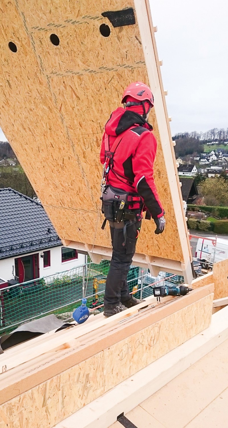Auf Baustellen werden regelmäßig große und schwere Holzbauelemente mit Hilfe eines Krans eingehoben. (Foto: Dennis Krause / BG BAU)