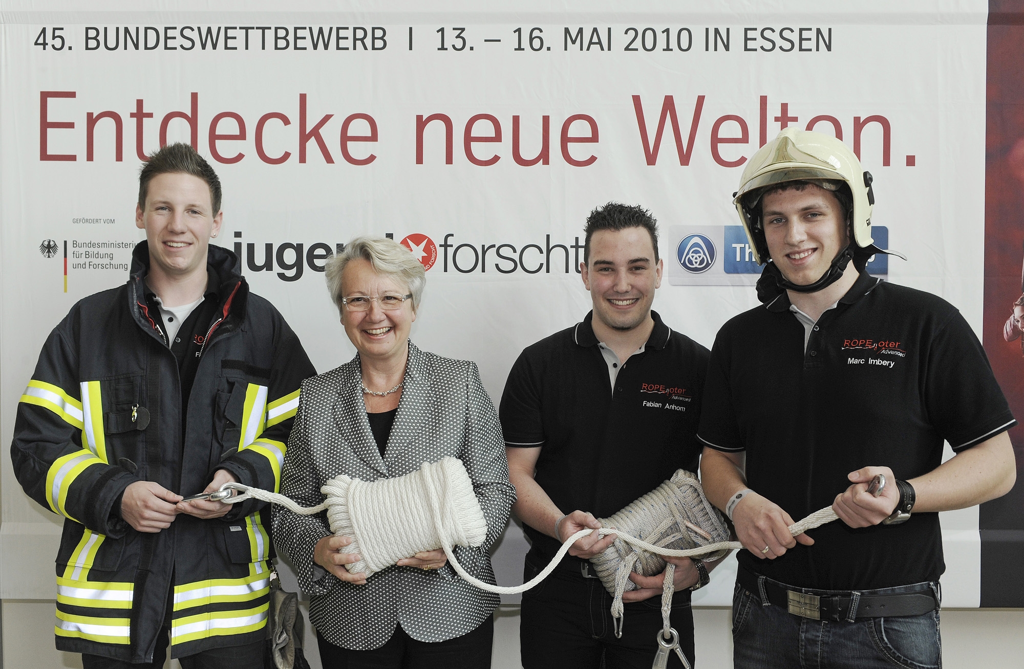 Den Preis für die originellste Arbeit (JPG, 1,5 MB) , gestiftet von der Bundeskanzlerin, sowie den Preis des Arbeitgeberverbandes Gesamtmetall erhielten Marc Imbery (20), Fabian Anhorn (21) und Fabian Rupp (21), Auszubildende der SICK AG in Waldkirch. Die drei entwickelten eine hochkomplexe automatisierte Wicklungsmaschine für Feuerwehrrettungsleinen, die nach jedem Gebrauch geprüft und so gewickelt werden müssen, dass sie im Ernstfall schnell abrollen und sicher tragen. Bislang geschieht das von Hand. Der ROPEoter Advanced sorgt neben einer erheblichen Zeitersparnis für hohe Genauigkeit beim Wickelvorgang und für eine zuverlässige Erkennung von Schwachstellen.