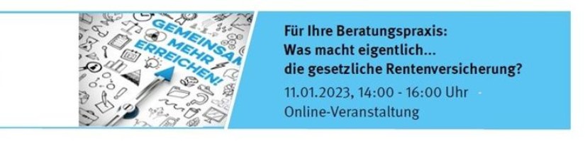 Am 11.01.2023 fand Teil 1 der Online-Seminarreihe „"Für Ihre Beratungspraxis – Was macht eigentlich… die gesetzliche Rentenversicherung?" statt. Circa 140 Aufsichtspersonen und weitere Präventionsfachkräfte erfuhren aus erster Hand alles über den gesetzlichen Auftrag, Handlungsfelder und Leistungen sowie Ansprechstellen der gesetzlichen Rentenversicherung in der Prävention und konnten ihre ganz individuellen Fragen an unseres Expertin richten.