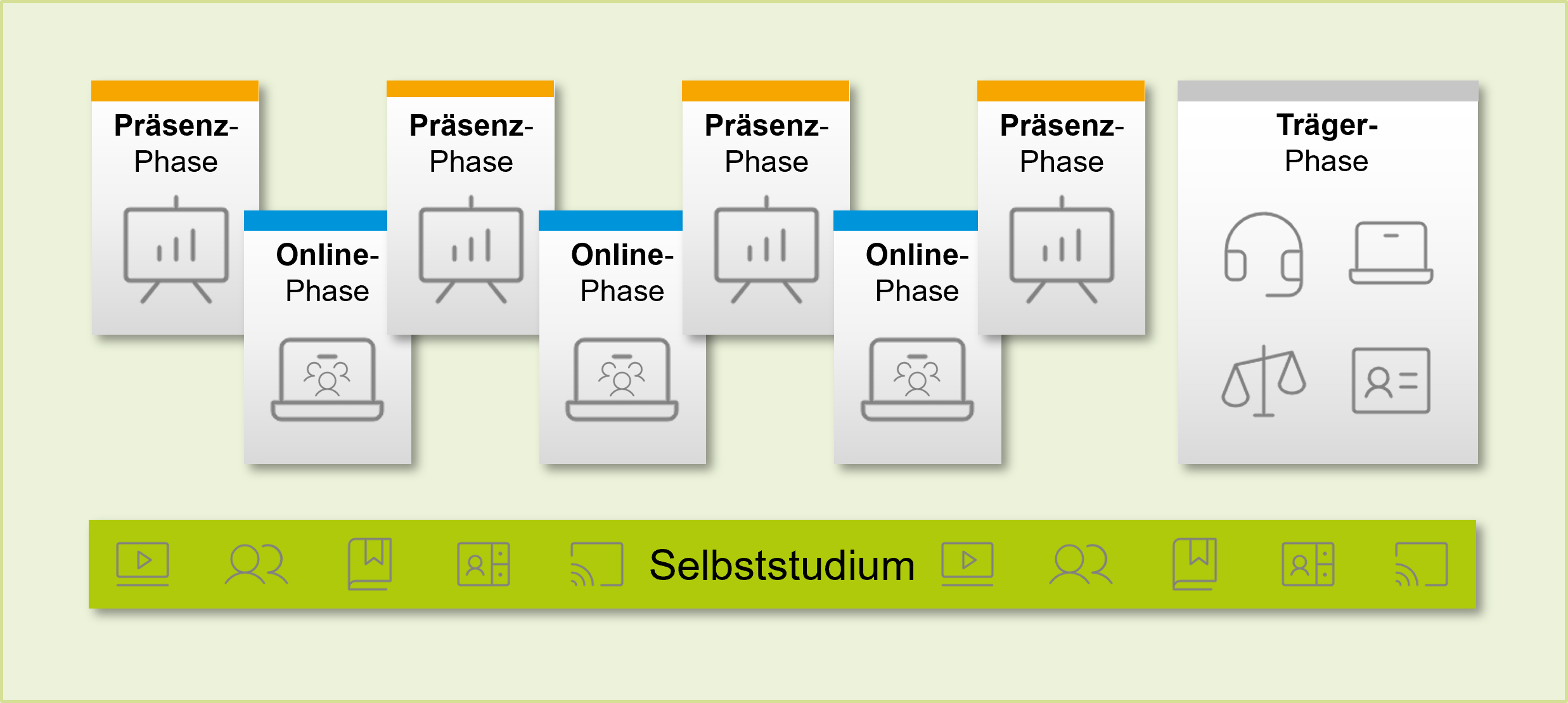 Das Lehr-Lern-Design basiert auf einem rollierenden Wechselmedienmodell. Dabei wechseln sich in den ersten vier Semestern die Präsenz- und Onlinephasen innerhalb der Hochschulmodule regelmäßig ab. Überdies sind die Onlinephasen sowohl synchron (z. B. Videokonferenzen) als auch asynchron (z. B. über die Lernplattform ILIAS) gestaltet und werden durch betreute Selbstlernphasen ergänzt.