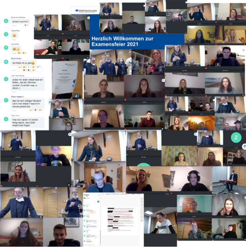Da mittlerweile die Corona-Inzidenzwerte wieder steigen, ist besondere Vorsicht geboten und die HGU ist sich Ihrer Verantwortung bewusst. Um diesen Festakt, der als Höhepunkt zum Ende einer akademischen Ausbildung gilt, nicht ganz ausfallen zu lassen, wurde eine „virtuelle Examensfeier" durchgeführt. So hatten die Studierenden als auch ihre Familienangehörigen, Freunde, Bekannte, Hochschulangehörigen und Interessierte der Unfallversicherungsträger die Chance, die erbrachte Leistung in einem angemessenen Rahmen zu feiern.