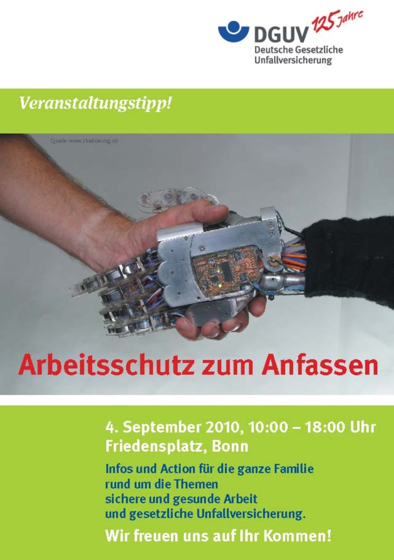 Wie kann ich auch im Büro fit bleiben? Wie laut ist eigentlich mein MP3-Player? Wie gut schützt meine Sonnenbrille? Antworten auf diese Fragen gibt es am 4. September auf dem Bonner Friedensplatz. Zum 125-jährigen Bestehen der gesetzlichen Unfallversicherung in Deutschland findet dort ein vielfältiges Aktionsprogramm für die ganze Familie statt. Im Zentrum steht das Thema gesunde und sichere Arbeit.
