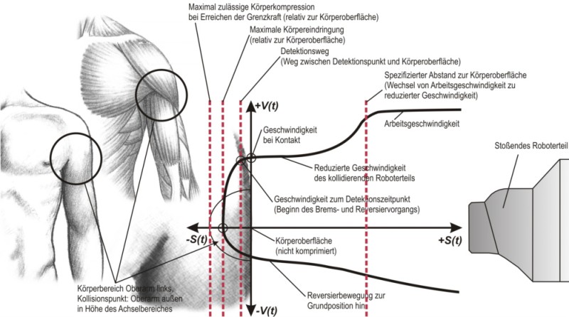 In einem bestimmungsgemäß durchgeführten kollaborierenden Arbeitsprozess sind Kollisionsrisiken zwischen einem Roboter und Personen nicht auszuschließen. Daher bestand die Aufgabe darin, die biomechanischen Beanspruchungseffekte einer Kollision so zu begrenzen, dass nur geringe, tolerable Beanspruchungsschweren für betroffene Personen auftreten können. Je nach Festlegung des Kollisionsrisikos in der Risikobeurteilung einer konkreten Arbeitsapplikation mit einem kollaborierenden Roboter wird als Beanspruchungsschwere entweder die Schmerzschwelle (Übergang von Druckgefühl in Schmerzgefühl) oder der Verletzungseintritt (Schwellung, geringfügiges Hämatom) herangezogen. Die festgelegte zulässige Schwere der Körperbeanspruchung kann durch Grenzwerte zusammenhängender Beanspruchungskriterien abgebildet werden.