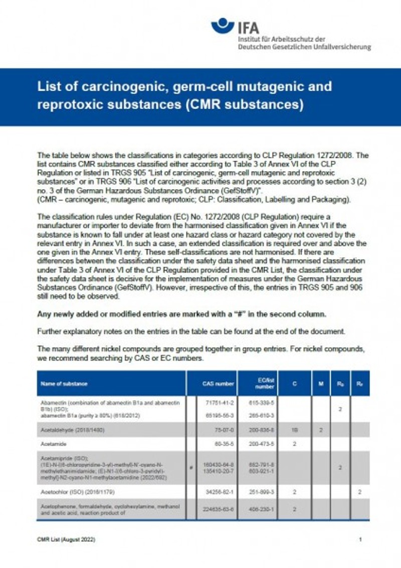 The CMR List is compiled and updated by the Institute for Occupational Safety and Health of the German Social Accident Insurance (IFA).
