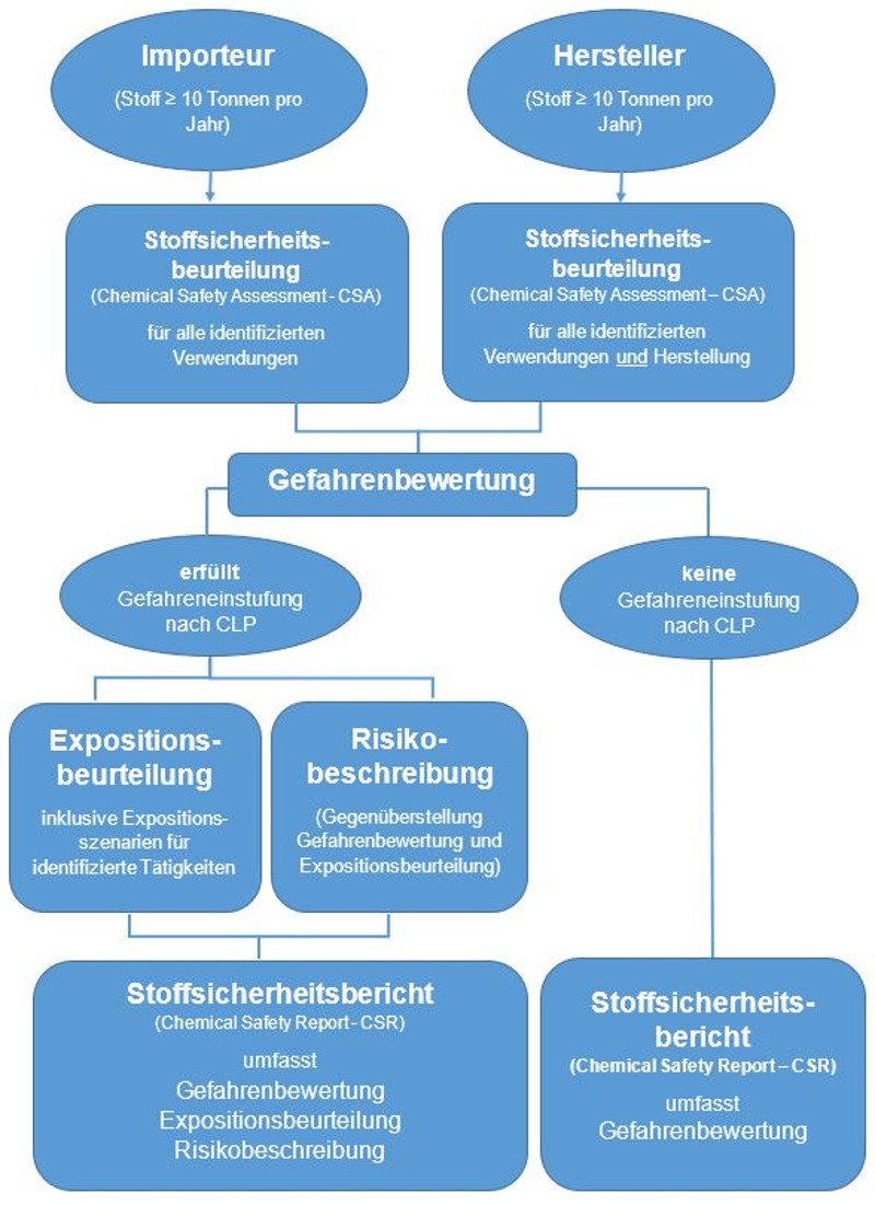 Sobald Sie als Registrant einen registrierungspflichtigen Stoff in Mengen von zehn Tonnen oder mehr pro Jahr herstellen oder importieren, müssen Sie eine Stoffsicherheitsbeurteilung (Chemical Safety Assessment - CSA) durchführen und diese in einem Stoffsicherheitsbericht (Chemical Safety Report - CSR) dokumentieren. Der Stoffsicherheitsbericht informiert über Wirkungen auf die menschliche Gesundheit und das Umweltverhalten.