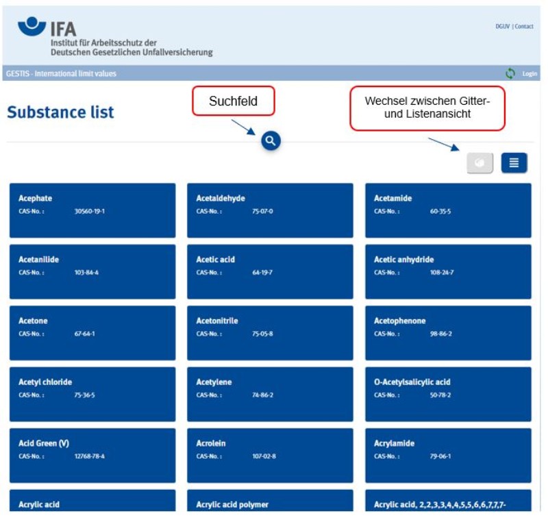 Beim Öffnen der Datenbank GESTIS-ILV wird die Stoffliste in alphabetischer Reihenfolge angezeigt – entweder in Raster- oder in Listenansicht. Dies lässt sich über die Schaltfläche oben rechts einstellen (siehe Abb. 1).