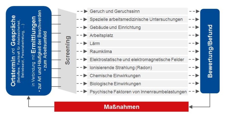 Das Konzept sieht vor, in einem ersten Schritt das Vorkommen und die Art gesundheitlicher Beschwerden festzustellen. Gleichzeitig sind erste Ermittlungen zum Arbeitsumfeld notwendig, um die wahrscheinlichen Ursachen der Beschwerden eingrenzen zu können. Bereits zu diesem Zeitpunkt empfehlen sich auch ein Ortstermin und Gespräche mit den Betroffenen. An dem Ortstermin und den Gesprächen sollten u. a. der arbeitsmedizinische Dienst und die Fachkraft für Arbeitssicherheit teilnehmen.