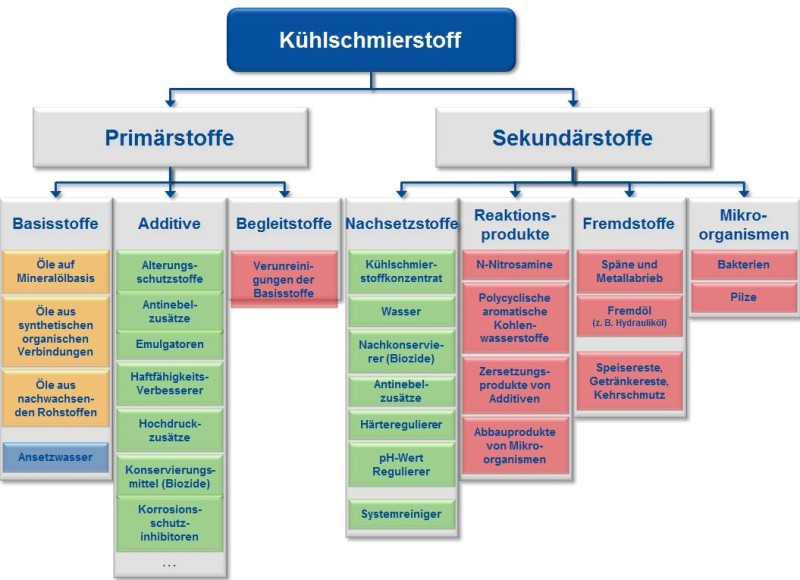Die Anzahl an möglichen Komponenten in Kühlschmierstoffen ist fast unendlich. Anhand von stoffspezifischen Strukturmerkmalen wird versucht, sie übersichtlich in Gruppen einzuteilen (s. Bild). Stoffe, die im verwendungsfertigen, aber noch ungebrauchten Zustand im Kühlschmierstoff enthalten sind, werden als Primärstoffe bezeichnet und in die Gruppen Basisstoffe, Additive und Begleitstoffe unterteilt. Unter den Sekundärstoffen versteht man die Stoffe, die erst während des Gebrauchs absichtlich zugeführt werden, beim Gebrauch entstehen oder eingeschleppt werden. Untergruppen sind in diesem Fall Nachsetzstoffe, Reaktionsprodukte, Mikroorganismen und Fremdstoffe.