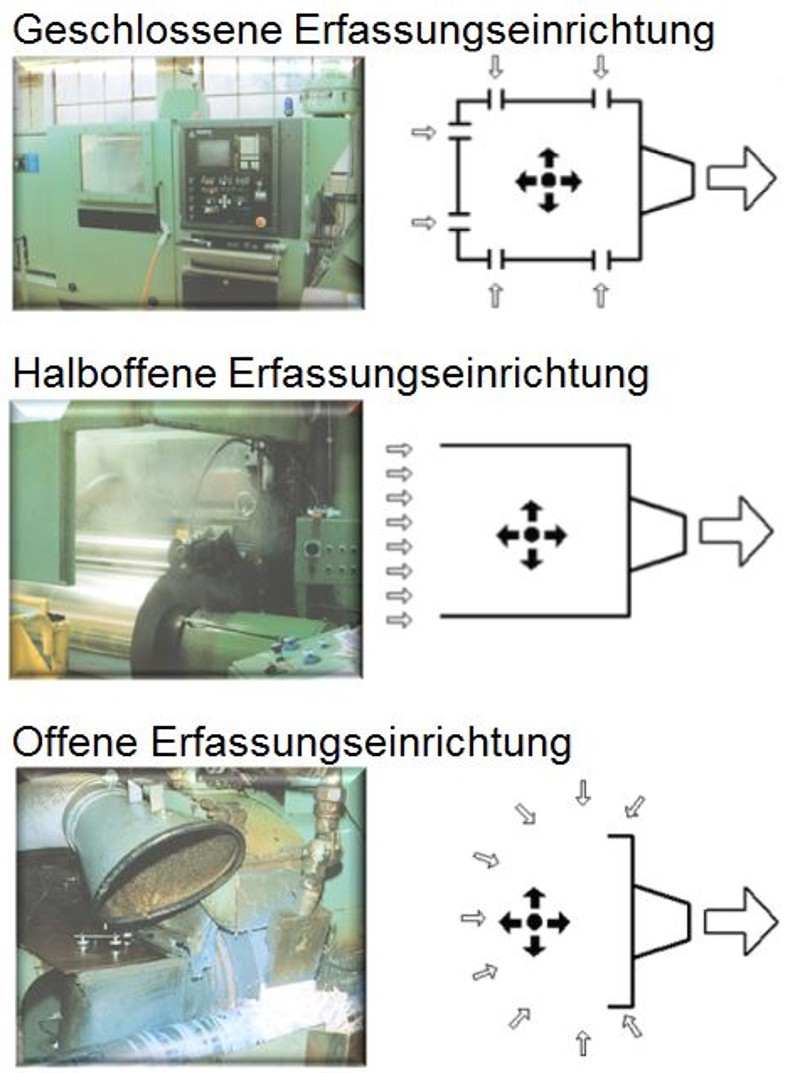 Für den Bereich der spanenden Bearbeitung mit KSS sind geschlossene Erfassungseinrichtungen (Einhausungen) vorzusehen. Die Erfassungsluftströme sind hier am geringsten und im Wesentlichen abhängig von Undichtigkeiten der Einhausung (nach VDI 3802-2).