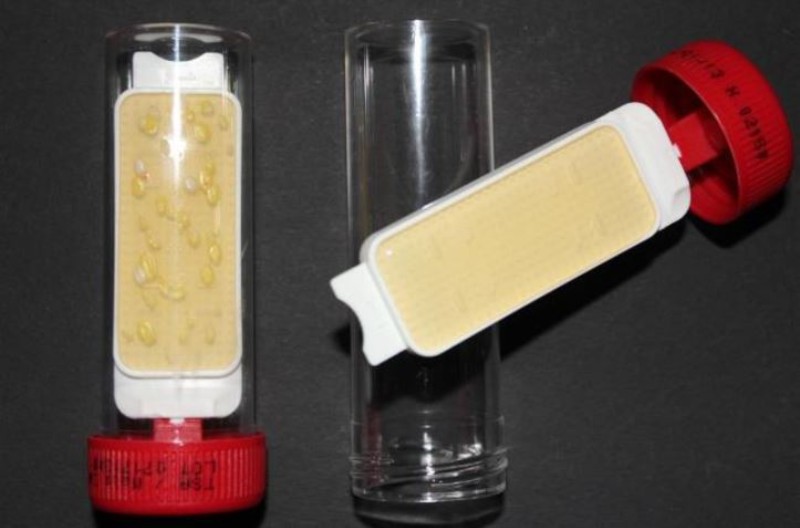 Dip-Slides (rechts vor dem Einsatz unbewachsen, links nach dem Einsatz mit Kolonien bewachsen)
