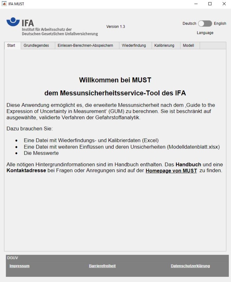 Eine Messunsicherheitsbetrachtung ist auch bei der Entwicklung von Messverfahren zur Bestimmung chemischer Arbeitsstoffe in der Luft notwendig. Die dafür erforderlichen Berechnungen sind in der Regel sehr aufwändig und zeitintensiv. Daher hat das IFA eine Anwendung entwickelt, die den Nutzerinnen und Nutzern für einen Teil der validierten Verfahren das Rechnen abnimmt: das Messunsicherheitservice-Tool MUST. Vorausgesetzt, man hält sich an das gewählte Verfahren und verwendet die dafür ausgesuchten Geräte, ist es ausreichend, die Messwerte in MUST einzugeben und die Validierungsdaten des Verfahrens hochzuladen. Dann erhält man das Ergebnis samt der zugehörigen erweiterten Messunsicherheit nach GUM. Mehr noch: MUST berechnet auch wie stark die einzelnen Geräte- und Verfahrenseffekte zur Messunsicherheit beitragen.