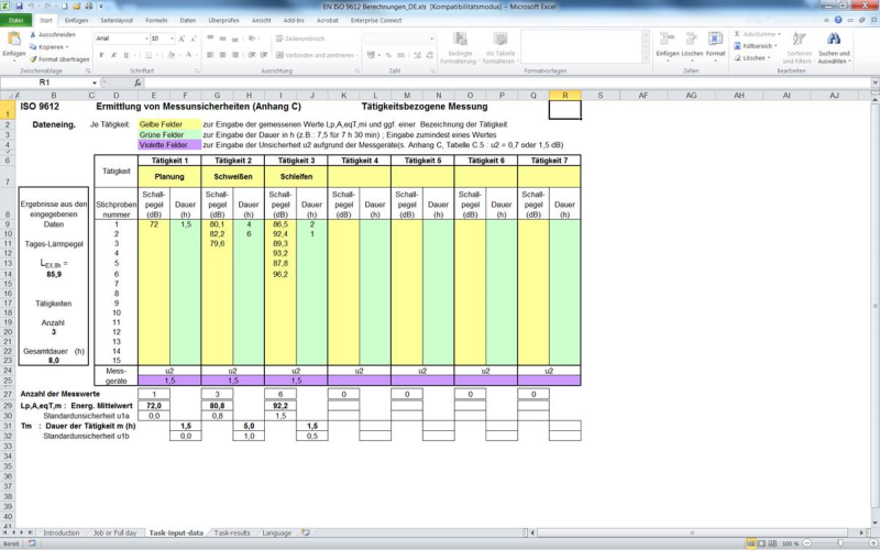 Mit der Norm ISO 9612 "Acoustics - Determination of occupational noise exposure - Engineering method" wurde ein Tabellenkalkulationsprogramm entwickelt, das bei der Bestimmung der erweiterten Unsicherheit Unterstützung bietet.