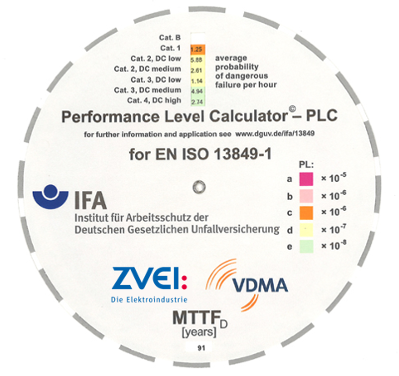 Zur einfachen Bestimmung des Performance Levels (PL) sicherheitsbezogener Maschinensteuerungen dient die PLC-Drehscheibe. Das Institut für Arbeitsschutz der DGUV (IFA) entwickelte sie mit Unterstützung des Verbands der Elektro- und Digitalindustrie (ZVEI) - Fachverband Automation und des Verbands Deutscher Maschinen- und Anlagenbau - VDMA.