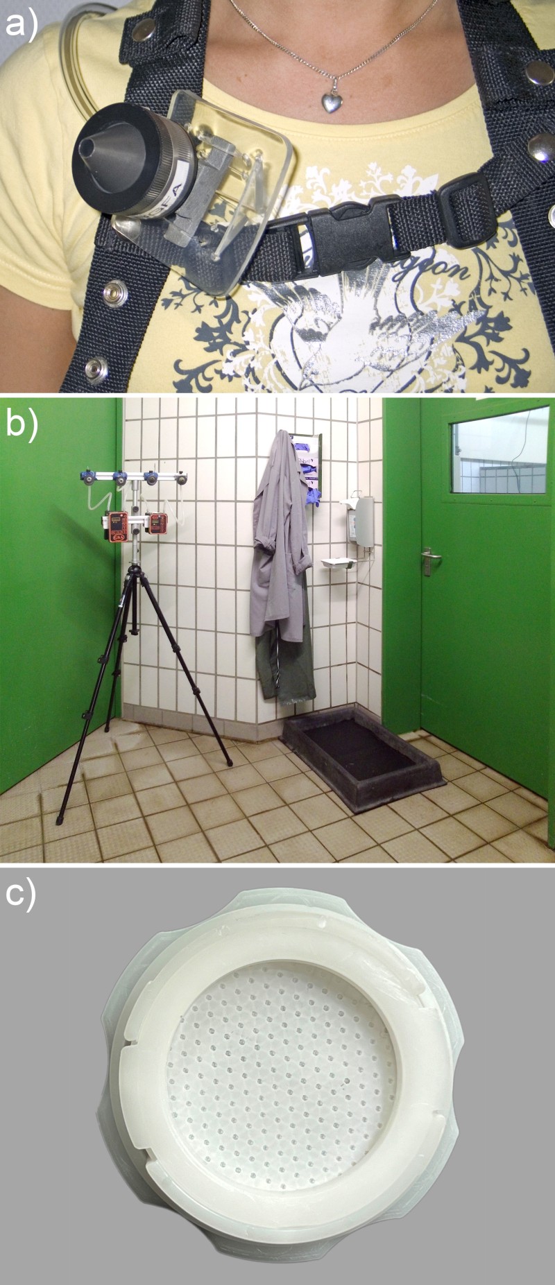 Abb. 1 Gesamtstaubprobenahme (GSP)-System: a) personengetragen, b) stationär, c) Teflon-Filter
