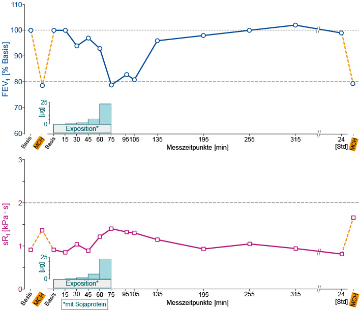 Die Basis-Lungenfunktion mittels Spirometrie und Bodyplethysmographie war unauffällig. Am Tag vor dem spezifischen inhalativen Provokationstest sowie am Tag danach wurde der Einkonzentrations-Vierstufen-Methacholintest durchgeführt. Dabei betrugen die in vier Stufen zu inhalierenden kumulativen Dosen 15 μg, 60 μg, 240 μg und 960 μg Methacholin. Sowohl vor als auch nach dem spezifischen Provokationstest war eine bronchiale Hyperreagibilität spirometrisch mit einem Abfall der Einsekundenkapazität (FEV1) von mehr als 20 % nachweisbar. Zu einer Zunahme der bronchialen Empfindlichkeit am Folgetag kam es allerdings nicht. Die Methacholin-Dosis, die eine mindestens 20 %ige Reduktion der FEV1 hervorgerufen hatte (PD20), betrug am Tag vor dem spezifischen Provokationstest 53 μg (FEV1-Abfall 21 %) und am Folgetag 221 μg (FEV1-Abfall 22 %).