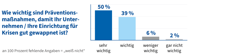 Die Ergebnisse zeigen zudem eine sehr hohe Zustimmung zur Bedeutung präventiver Maßnahmen: 89 Prozent halten Vorkehrungen wie Notfallpläne, Brandschutzmaßnahmen oder Maßnahmen zur Arbeitssicherheit für wichtig oder sehr wichtig, um auf Krisenfälle vorbereitet zu sein. Nur 8 Prozent bewerten solche Maßnahmen als weniger oder gar nicht wichtig.
