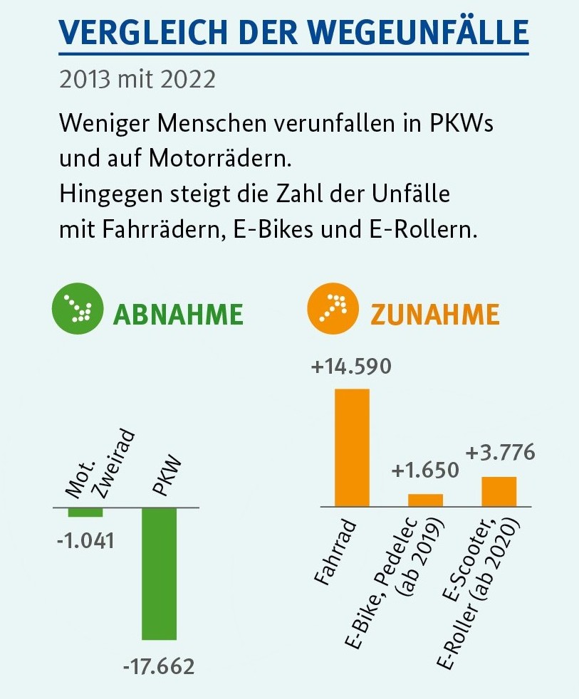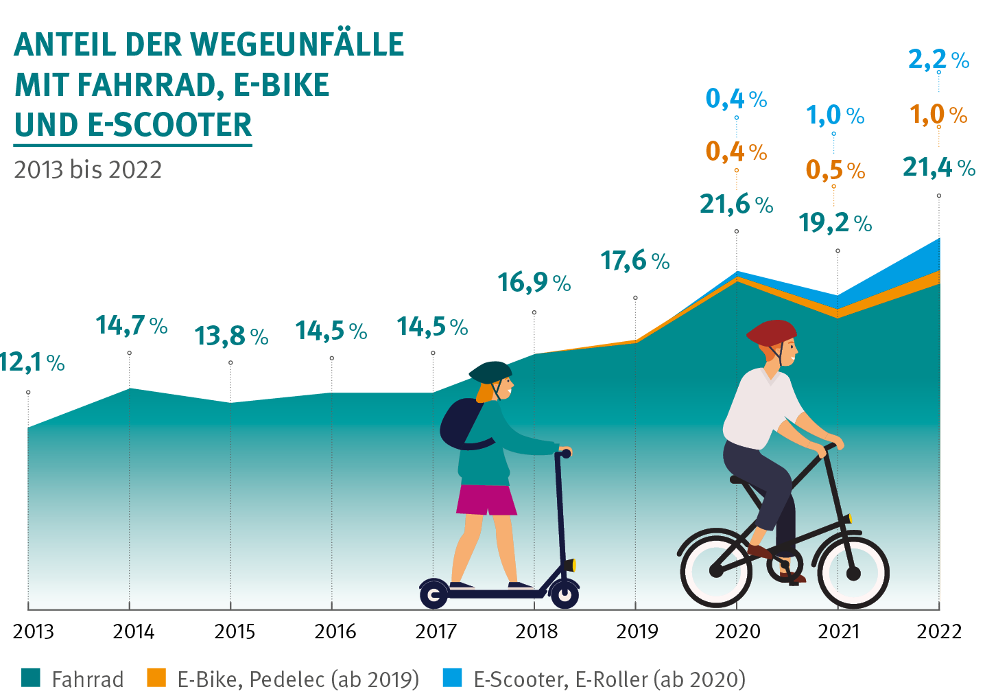 Bei den Wegeunfällen mit dem Fahrrad ist jedoch eine deutliche Zunahme zu sehen. Auch die Wegeunfälle mit dem E-Bike, Pedelec, E-Scooter und E-Roller sind gestiegen. Diese Wegeunfälle werden allerdings erst seit dem Jahr 2019 beziehungsweise 2020 von den Trägern der gesetzlichen Unfallversicherung erfasst.