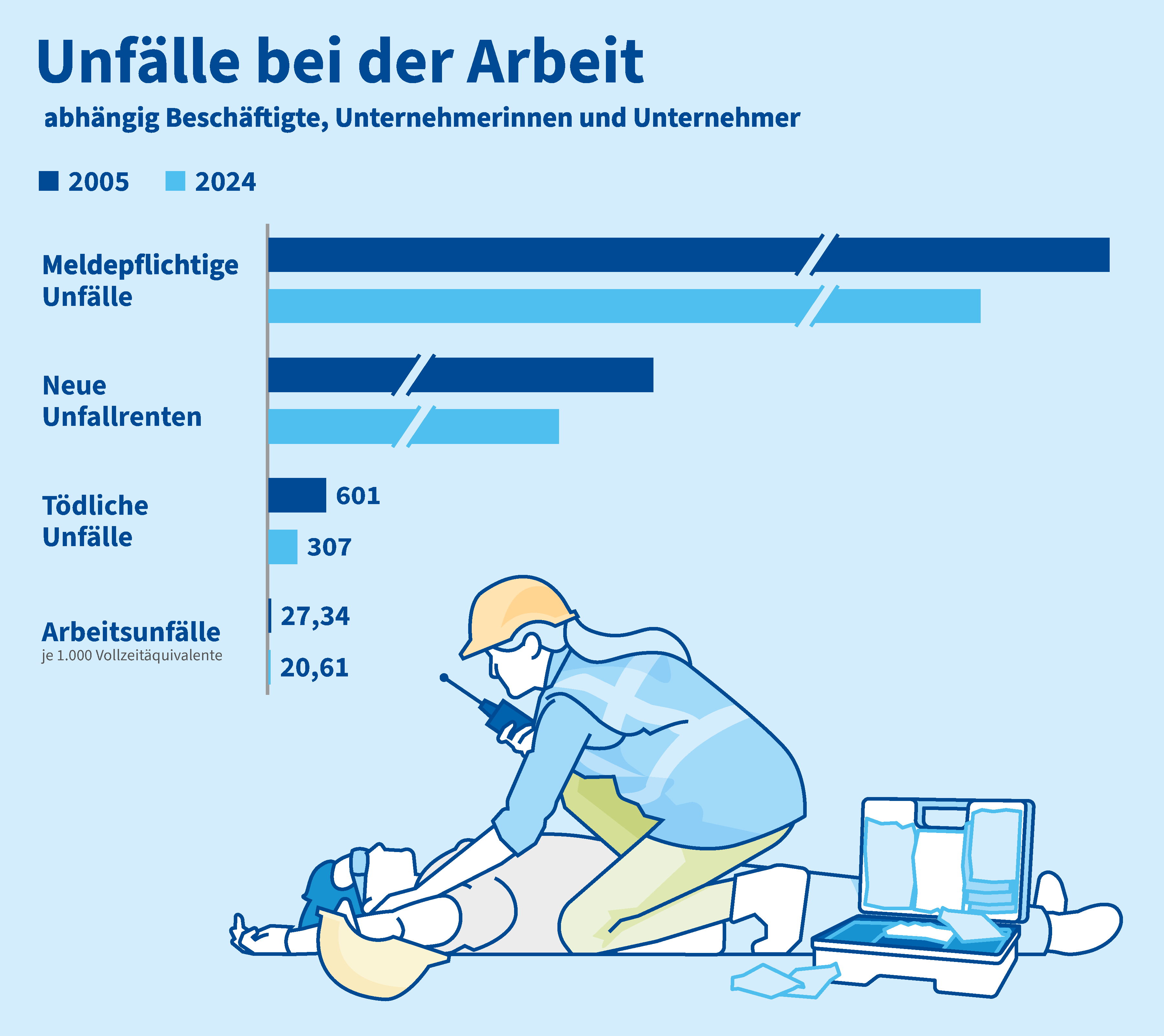 Insgesamt ereigneten sich im vergangenen Jahr 712.257 meldepflichtige Arbeitsunfälle (–3,8 Prozent) sowie 168.648 meldepflichtige Wegeunfälle (–6,0 Prozent), also Unfälle von und zur Arbeit. 307 Versicherte verloren aufgrund eines Arbeitsunfalls ihr Leben, 214 aufgrund eines Wegeunfalls. 12.821 Versicherte erhielten 2024 erstmals eine Rente aufgrund eines Arbeits- oder Wegeunfalls.