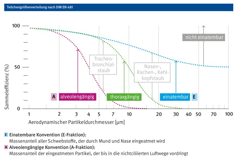 Für diese Teilchen lässt sich keine genaue Größe angeben, sondern lediglich eine Größenverteilung. Beschrieben wird dieser Bereich in der DIN EN 481 (siehe Abb.). Die abgebildete Kurve für die A-Fraktion stellt somit die Wahrscheinlichkeit dar, mit der Teilchen mit einem bestimmten Aerodynamischen Durchmesser in den Alveolen abgeschieden werden. Ein Probenahmegerät für die A-Staubmessung muss daher die gleiche Abscheidecharakteristik aufweisen.
